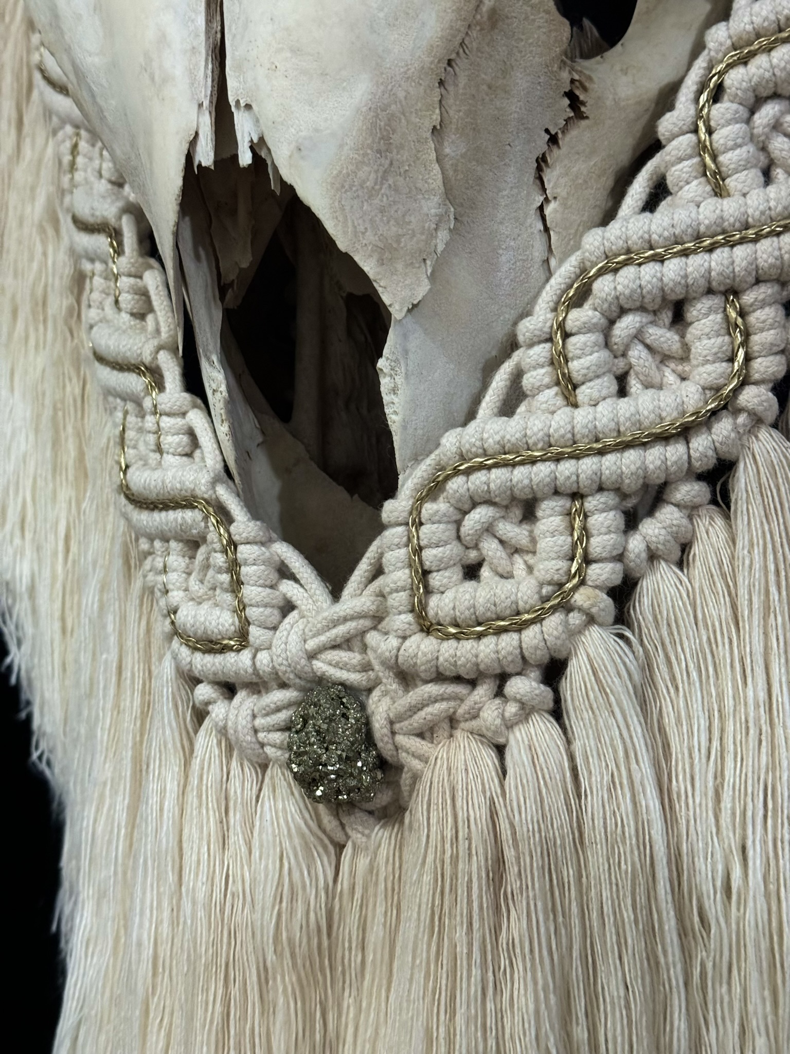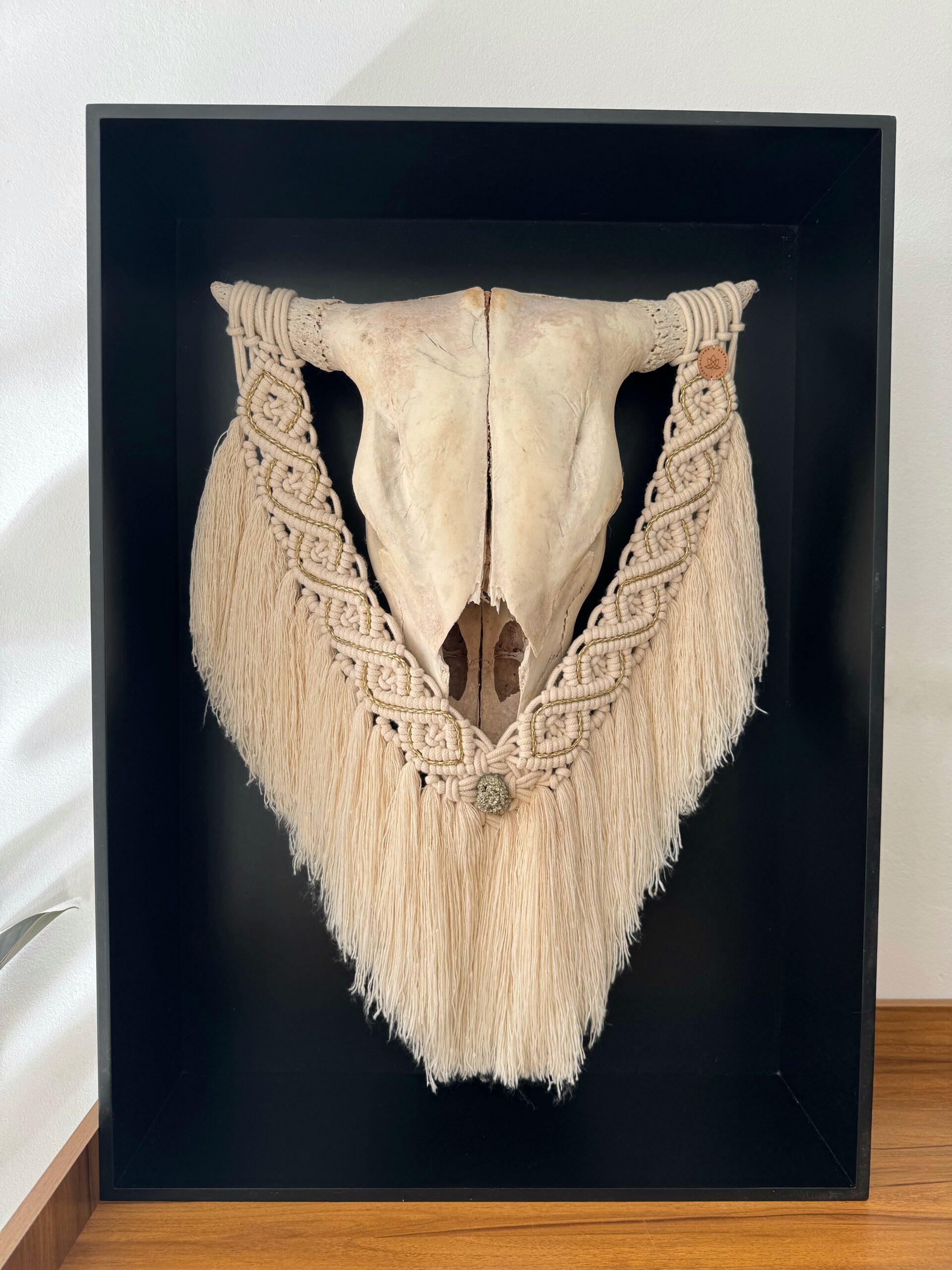 Um painel imponente e único, feito a partir de um crânio bovino com aplicação de macrame em cordão 100% algodão e detalhes em fio dourado para harmonizar com a pedra pirita, uma das mais poderosas pedras para atrair prosperidade, a moldura preta fazendo contraste com o cranio da mais imponencia e elegancia à peça. Sugere-se a aplicação como peça de destaque em áreas goumet, lareiras, salas ou onde mais sua imaginação permitir.