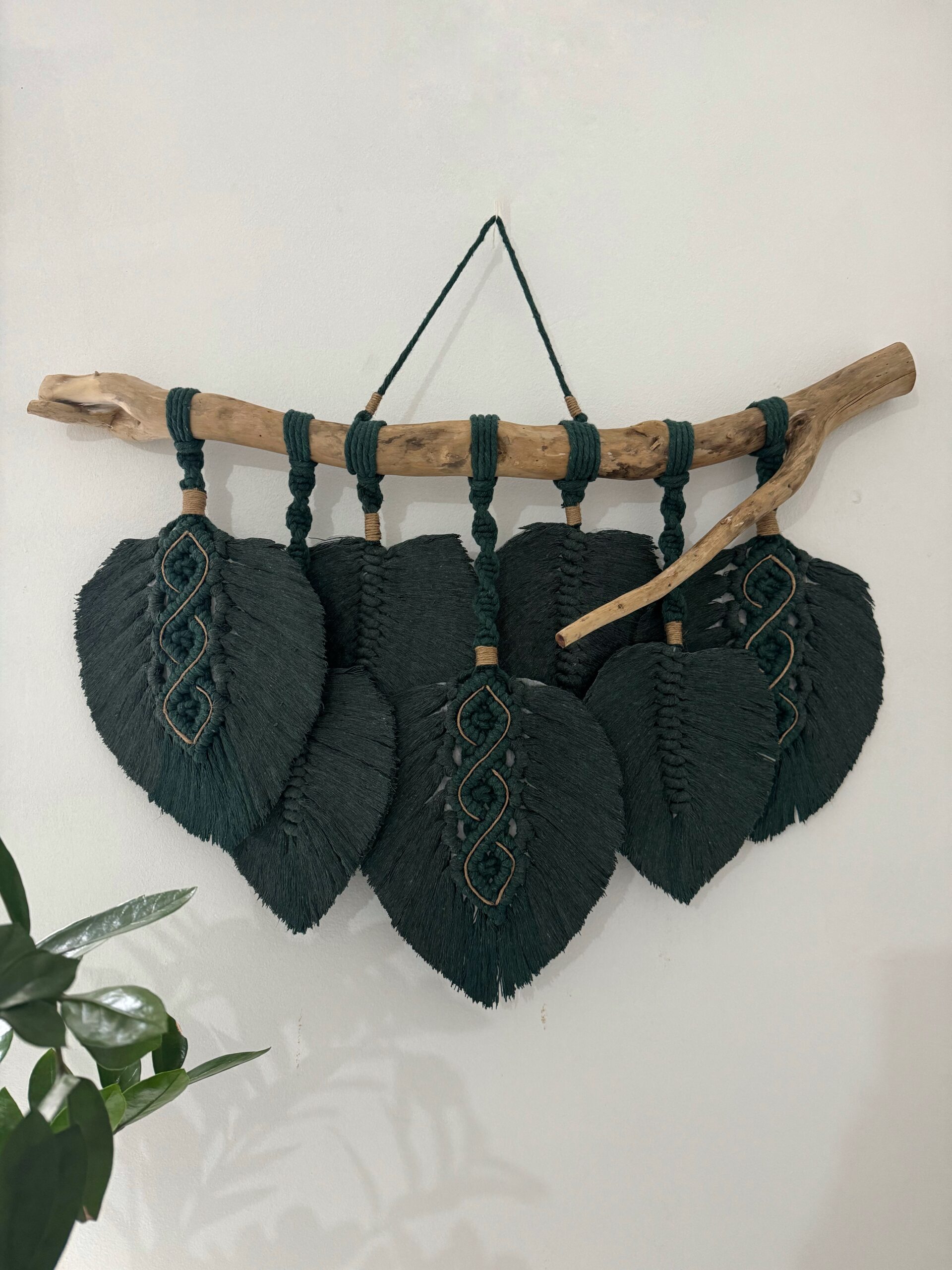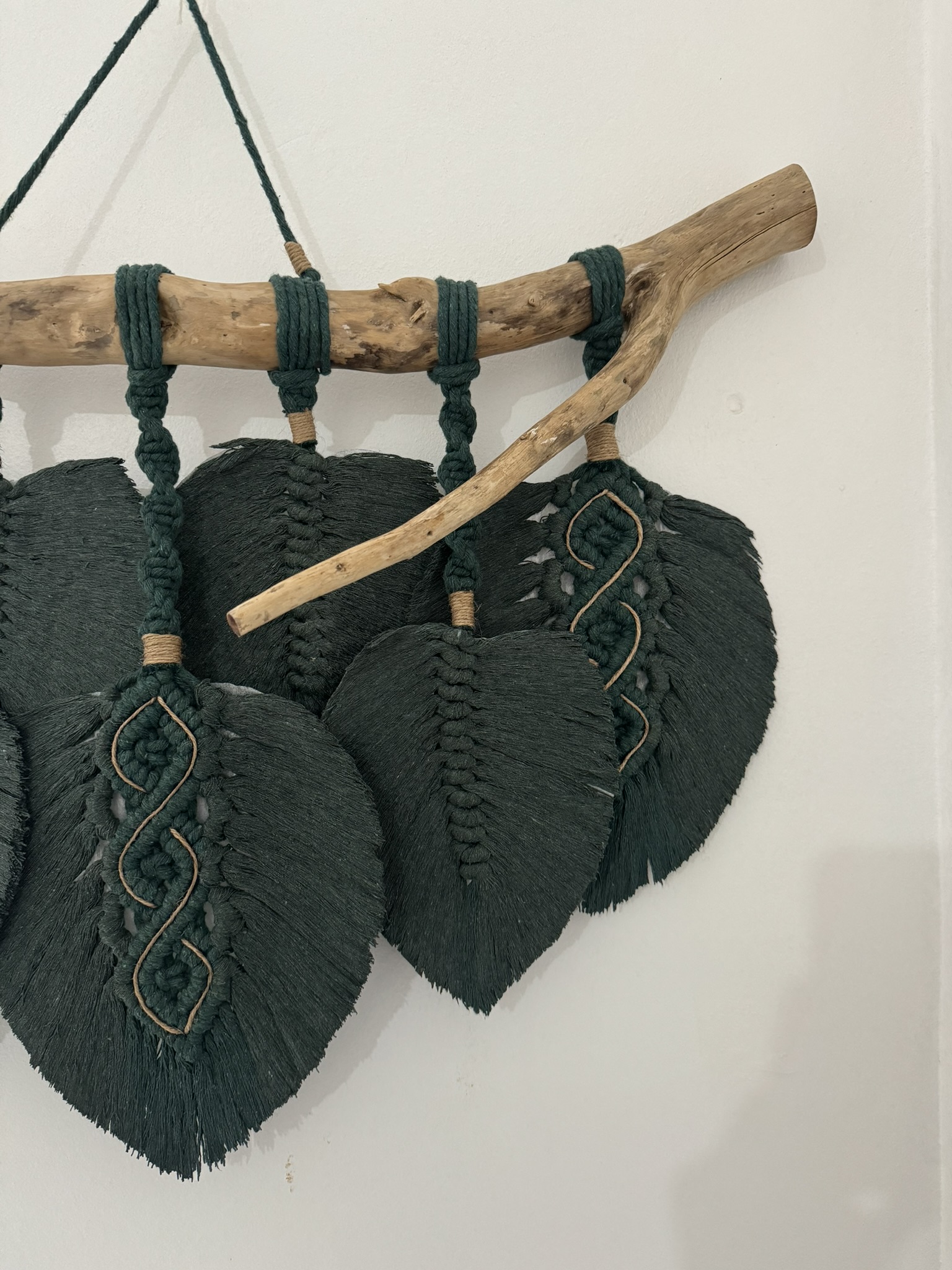 Painel Folhas é um painel muito adorado no macrame, sua cor em verde esmeralda traz um toque de elegância para o ambiente. Pode ser usado em composição com outras peças como quadros ou plantas, na sala, no home office, no quarto, no hall de entrada ou onde mais sua imaginação permitir.