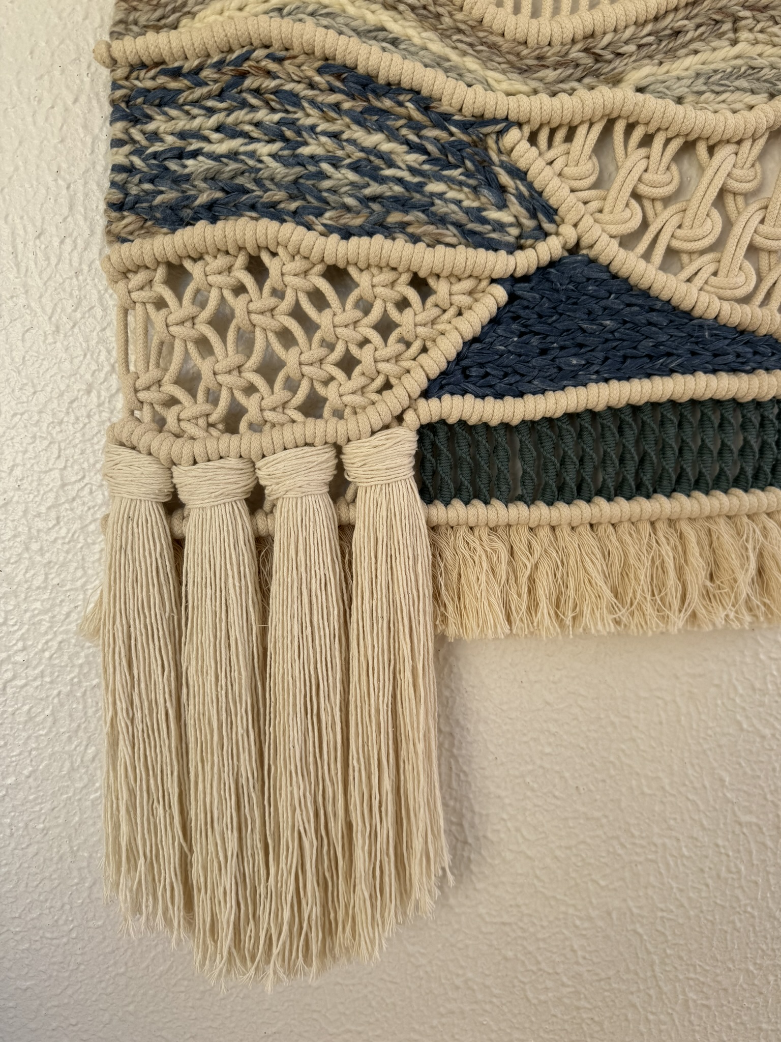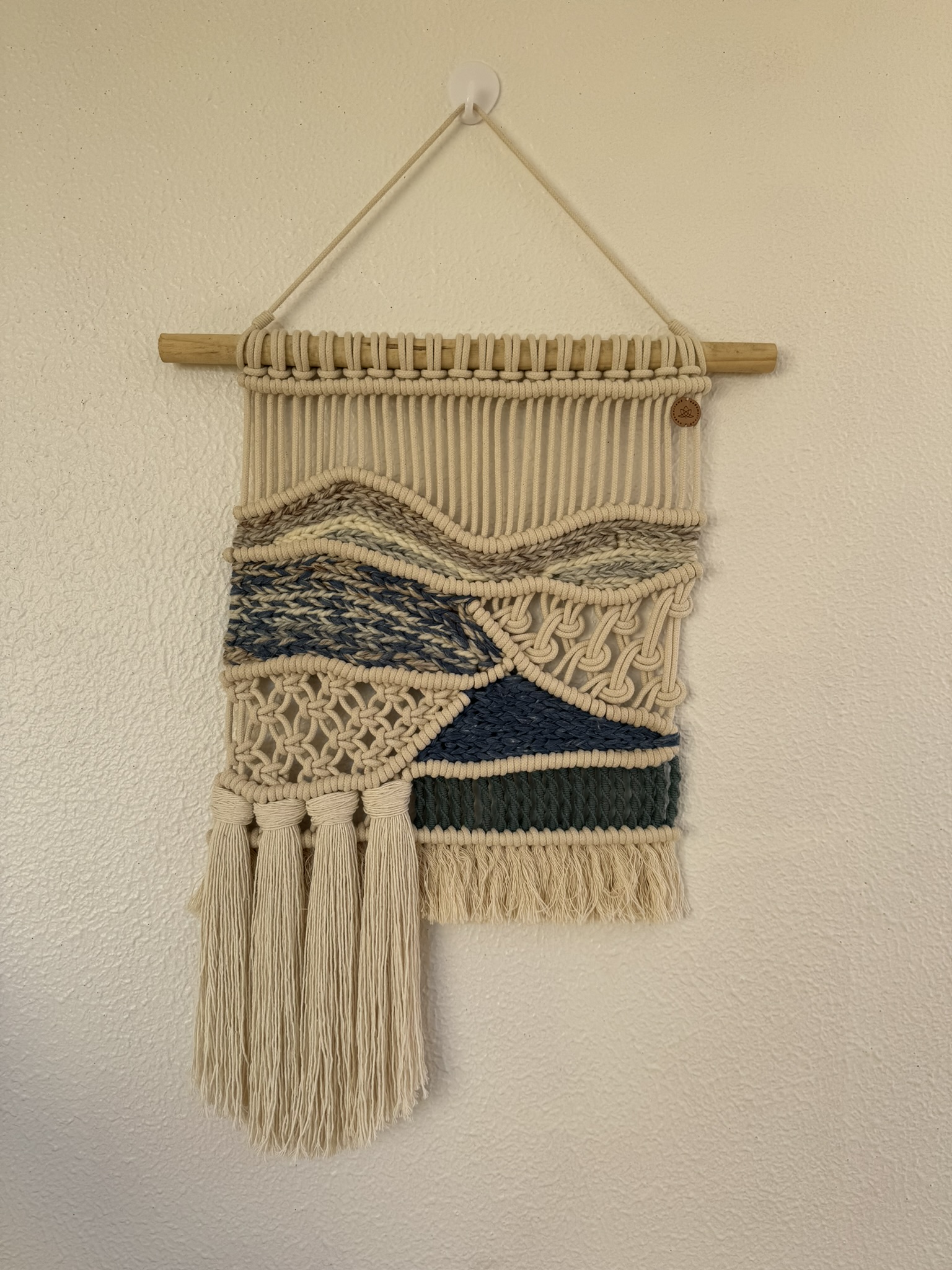 Painel Mar é um painel feito com técnica de tapeçaria que remete ao mar, por suas texturas, cores e formas organicas, os tons de azuis junto com o cru traz uma sensação de calmaria e uma neutralidade para peça. Pode ser usado em composição com outras peças como quadros ou plantas, na sala, no home office, no quarto, no hall de entrada ou onde mais sua imaginação permitir.